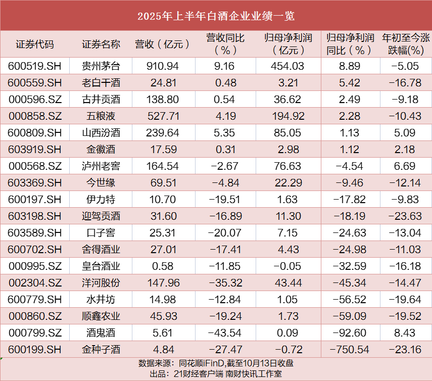 白酒企业的业绩也出现较为明显分化。18家A股上市白酒企业中,12家2025年上半年的净利润同比下滑,占比超六成。部分腰部及区域品牌企净利润跌幅超40%。不过,贵州茅台、五粮液(000858)、山西汾酒(600809)等头部品牌仍维持一定增速。其中,贵州茅台2025年上半年的归母净利润达454.03亿元,同比增长8.89%,表现相对稳健。